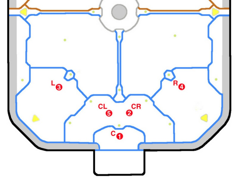 This diagram is labeled for each possible starting kickoff positions. As you can see, there are five possible positions. They are labeled R for right, L for left, C for Center. So CR is center-right and CL is center-left.