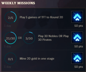 Weekly Missions offer a lot more points compared to the Orb of Enlightenment. These missions will require you to try out different builds and playstyles within TFT, offering 50 TFT Beta Pass Points upon completion. As you can see in the image above, there are currently only three Weekly Missions available. If you've completed all three of your initial missions, they'll reset immediately so you can continue to farm your TFT Beta Pass Points. Be careful not to throw your ranked games to complete these Weekly Missions!