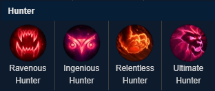 Now we move onto the final line in the Domination path, the Hunter line, and we’re starting with Ravenous Hunter. This rune grants you 1.5% healing off of ability damage. When you kill an enemy champion, that is counted as a Bounty Hunter stack and will increase your healing by 2.5% per stack, maxing out at 14%. When you use area of effect abilities, however, the healing is reduced by a third.