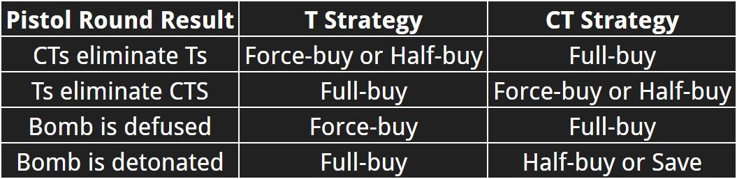 There are no economic decisions to be made in the pistol round, so round two is when the economic game kicks off. The pistol can end in any of the four main scenarios and your buy for round two should be based on which of them happened. Time expiration is extremely rare in pistols, so it is not listed. After the early rounds, one team is going to have money, weapons, and a lead while the other will be broke, on an eco, and starting the game on the wrong foot. Here’s what you can do in each scenario to give your team the edge in the early game: