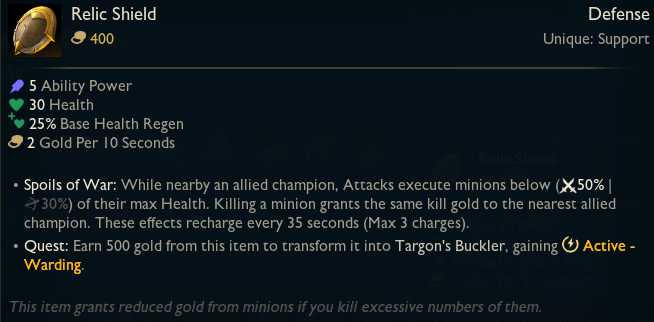Relic Shield is an item usually taken by melee AP tanks, as it provides AP and Health Regeneration, but some AP ranged Supports can opt for it as well. This item has a unique passive that allows its owner to execute minions below 50% HP (melee) and 30% HP (ranged), which can be useful in specific matchups to reach Level 2 first by executing the first two melee minions of the second wave. This item is excellent for champions like Rell or Nautilus.