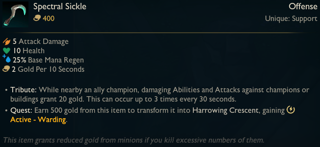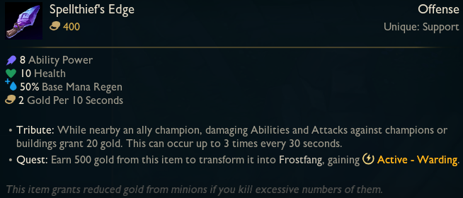 Spellthief’s Edge is an item for AP ranged Supports that mainly use their spells and auto-attacks to poke the enemy laners. The extra +8 Ability Power and +25% Mana Regeneration over its AD counterpart (Spectral Sickle) allows Mage Supports to easily use their spells to deal damage in lane without worrying about mana issues. This item is ideal for AP Supports such as Janna or Karma.