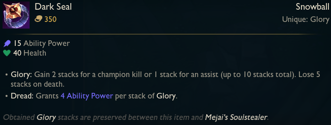 Dark Seal is a situational item that you should only consider whilst playing an AP champion and you strongly believe that you can win the lane by getting a large number of kills (mostly on champions like Sylas, Katarina). Due to its potential upgrade to Mejai’s Soulstealer, this item is high-risk, high-reward and should be used carefully, as you can fall behind if you do not manage to snowball.