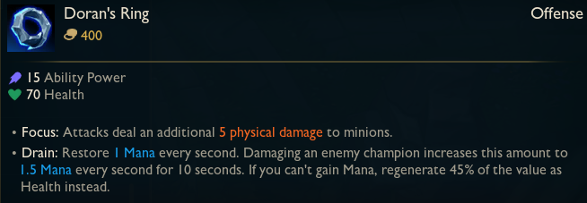 Doran’s Ring is an item usually obtained by AP top laners (such as Mordekaiser, Teemo) that enables them to poke their enemy without losing too much mana. The extra health and damage to minions are similar to the stats that Doran’s Shield provide (only +70 HP, compared to +80 HP), but the additional +15 Ability Power allows for an increased damage against champions (and minions) using spells, therefore making it a more offensive option for Mages.