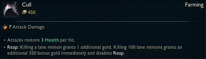 You can go any item previously mentioned here. However, Cull could be one of the best options in this matchup, since there is a low kill threat in this lane, and the extra +350 gold should allow you to get ahead at the end of the laning phase.
