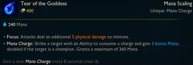Tear of the Goddess - Recommended on champions like Ezreal/Seraphine/Sivir. Great item if you want to rush Manamune during later stages.