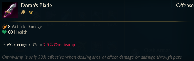 Doran’s Blade is the most aggressive option for a top laner, as it allows you to deal extra damage and have better chances of survival during the early fights (due to the extra health that it provides). Should normally be considered on champions that have all-in potential pre-level 6 (for example, Jayce, Jax), but not if they’re laning against tanky champions (such as Malphite, Ornn) because its stats do not necessarily outweigh the benefits of a safer option.