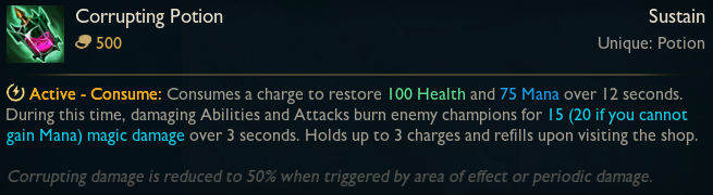 Corrupting Potion is a safe option that you should consider in matchups against champions with greater range than you, as it allows you to stay in lane for longer periods of time. It can be taken on most mid lane champions, although it is not the most recommended choice.