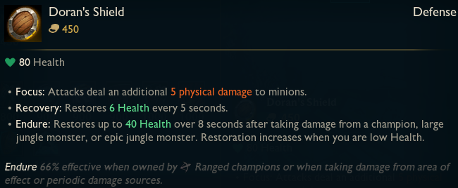 Doran’s Shield is a safer option compared to Doran’s Blade that generates a similar value in health (+80) and deals an additional 5 damage to minions (whereas the +8 AD value applies to damage dealt to champions as well). Nevertheless, any time you take damage from a champion, you restore health and you survive in lane for longer times than with DB. This item is good for matchups that allow extended trades and against poke champions (for example, Teemo, Jayce) or champions with burst, as it guarantees that you do not die easily.