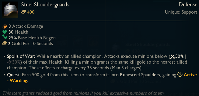 Steel Shoulderguards is an item usually taken on melee tanky Supports that have high early cooldowns due to its extra 3 AD that can be used to deal more damage with your auto-attacks. This item has a unique passive that allows its owner to execute minions below 50% HP (melee) and 30% HP (ranged), which can be useful in specific matchups to reach level 2 first by executing the first 2 melee minions of the second wave. Steel Shoulderguards is the perfect item for champions like Thresh or Pyke.