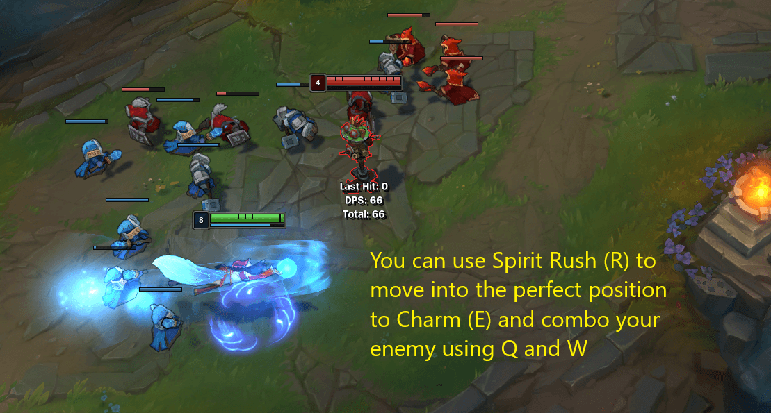 Ideally, you will want to Charm your enemies and use both Q and W to burst them down while they are unable to react. You can engage with your R to surprise your enemies and then Charm them, or you can use your R to safely disengage. As it has two extra charges, you can usually engage with R, burst them down, and quickly disengage if needed. Charm can be used to pull enemies close to your turret or ally team, as well as used to distract your enemy from harming members of your team.