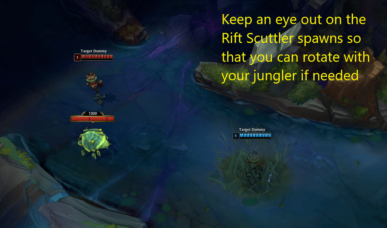 If you can not find a good opportunity to roam and gank, make sure you are doing your best to farm the lane minions, especially if you can not easily trade with your enemy laner. If you can not get kills or assists, cs is going to be your ticket to success, and can help you catch up to a lane bully. Since you are playing the midlane, you have both the Rift Herald or Baron and the Dragon on either side of you to contest, so you always want to be on the lookout for when your allies might need your assistance. Fighting over Rift Scuttlers is also a good opportunity to rotate and help secure, especially if the enemy jungler is sighted nearby.