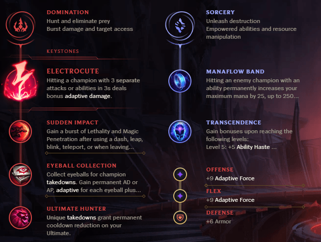 As far as runes go, Ahri has two main options here. You can go Domination as your primary with Electrocute, Sudden Impact, Eyeball Collection, and Ultimate Hunter, with Sorcery as your secondary with Manaflow Band and Transcendence. Her second option is Inspiration as your primary with Glacial Augment, Magical Footwear, Minion Dematerializer, and Cosmic Insight and then Domination as your secondary with Cheap Shot and Ultimate Hunter. For summoner spells, you will always want to have Flash paired with either Ignite or Teleport. Ignite is best if you plan to constantly duel it out with your enemy laner and need a finishing ability, while Teleport can be an optimal tool to quickly arrive to team fights or return to lane after a hard battle.