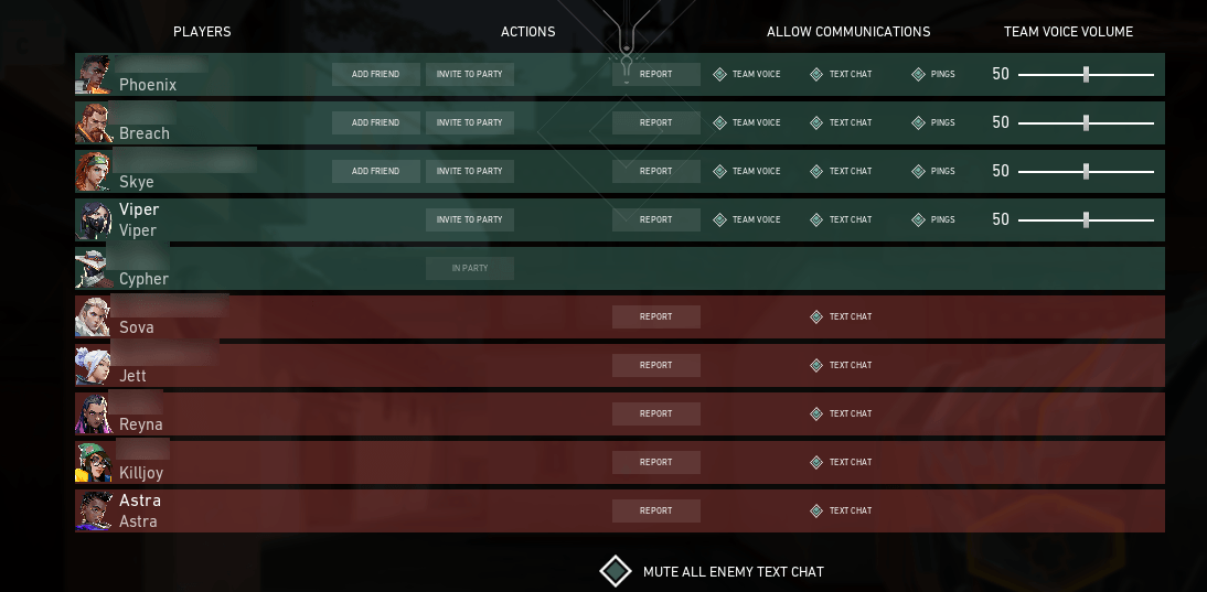 If you hit Esc in the middle of your game, the first thing that should pop up should be the player list. Here you can adjust who you want to hear and who you'd want to hear less from. There are options to turn off text and voice for teammates. For the enemy team, you can mute text chat from certain individuals. There is also a very convenient "Mute All Enemy Text Chat" button at the bottom in case it's just best to be safe and not deal with the enemy team at all.