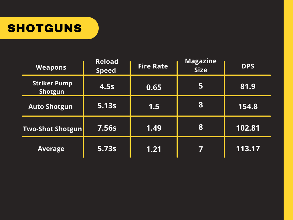 Reload Speed, Damage Per Second (DPS), Magazine Size, and Fire Rate. These are the basic statistics we are going to be using to compare the weapons.