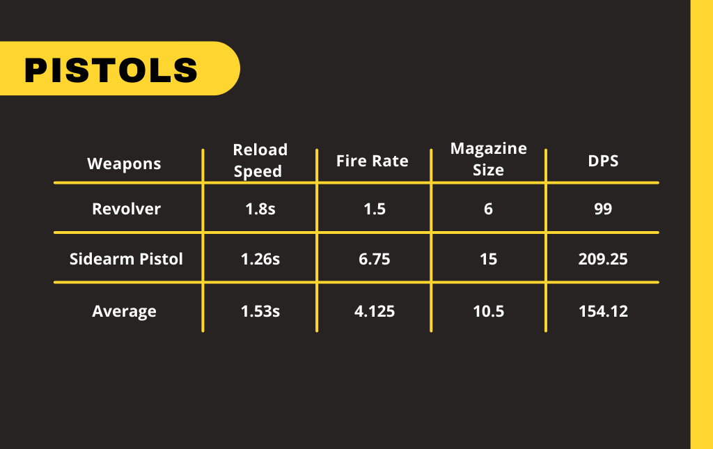 The two Pistols available at the moment are the Revolver and Sidearm Pistol. The Sidearm Pistol outclasses the Revolver in every category possible, leaving the Revolver pretty much useless.
