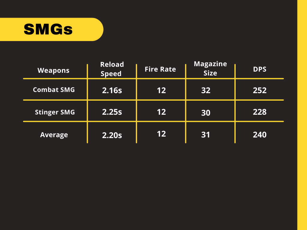 The Stinger SMG does have some advantages over the Combat SMG that was not mentioned in the table above, though. It has a lower recoil and does not lose structure damage at range. Meaning if you struggle with your aim, you may find the Stinger SMG easier to use in destroying builds and hitting your opponents with more shots.