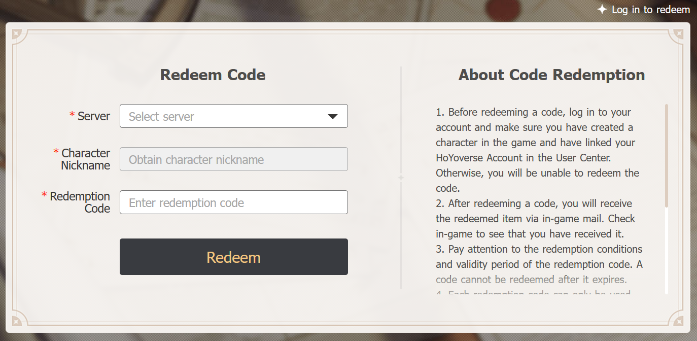 Another method is through HoYoverse’s Genshin Impact website where you will need to login before selecting the appropriate server and Character name. Each code will only work once per Character, but you may use them again on Characters from different servers/regions.