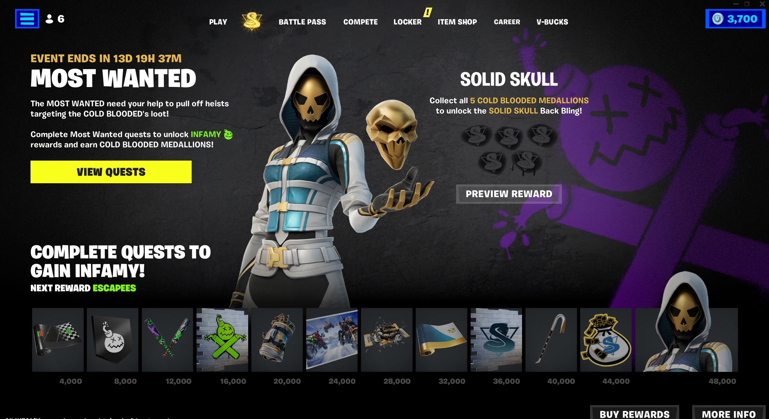 Each quest rewards a certain amount of Infamy, which goes towards unlocking the various cosmetics associated with the event. If a player completes enough quests in a single set, they will receive one Cold Blooded Medallion. Collecting all five of these medallions will reward the player with the Solid Skull back bling, in addition to all the rewards obtained through Infamy.