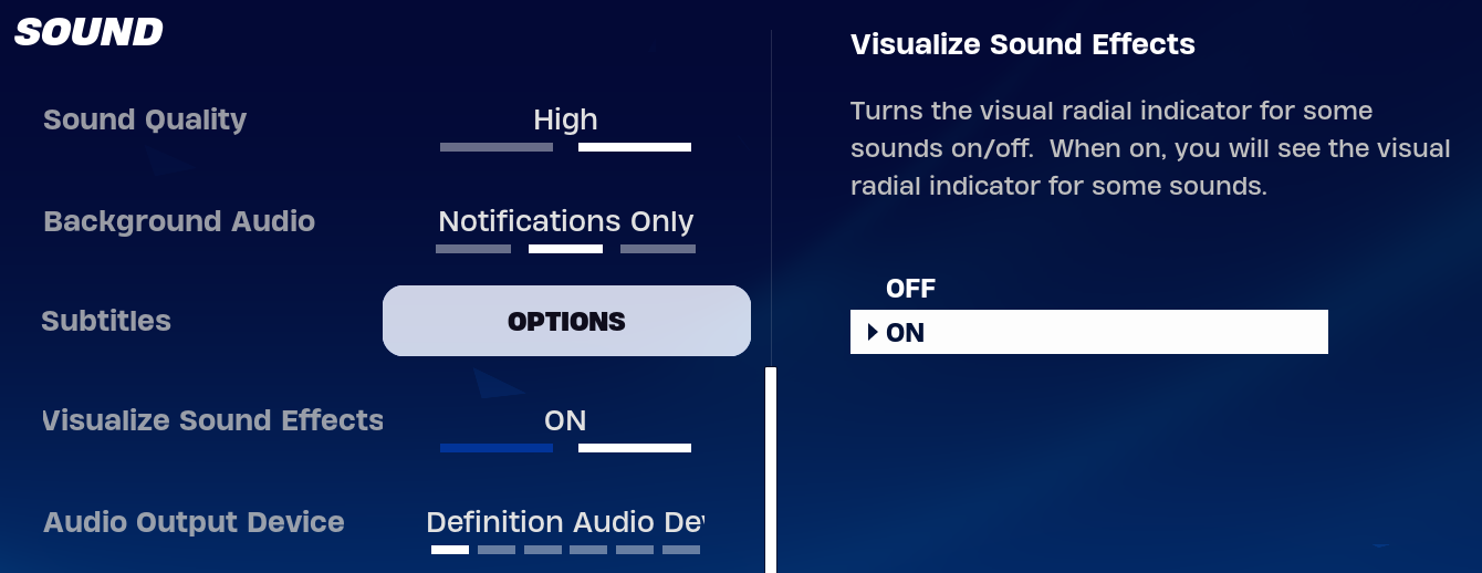 One thing that every player should have enabled, no matter what, is the Visualize Sound Effects option. This enables a visual indicator for some sounds like gunfire, gliders, footsteps, and more. This is extremely helpful when you are in a high-pressure situation or similar and may not hear everything that is happening around you. This setting seriously gives you an edge in-game, and it is one of the most important things to implement in your gameplay.
