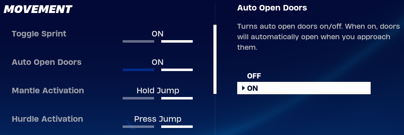 There is a lot to unpack in this section since there are so many different settings that you can change and edit. A common trend you may have noticed is that many of these settings can be one’s personal preference, but here are some settings that you should consider changing around and experimenting with. Auto-Opening Doors can be a convenient setting to play around with; it eliminates a keystroke, allowing you to not have to worry about pressing the interact key if you are fighting indoors.