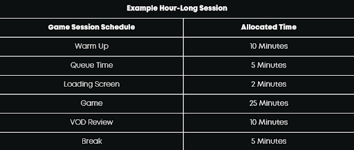 If you have enough time for multiple games in one session while accounting for these necessities, imagine each session as a 'best-of' format. For example, if you have enough time in a session to have three games, pretend it's a best-of-three and act accordingly. If you win the first two games, do not play the third. Instead, use the remaining time to do a VOD review, analyzing what you did well and what you were thinking about when making those decisions while it's still fresh in your mind. If you lose both games, instead, VOD review and analyze what you did well and what you did poorly, considering your thought processes and how you can refine them in the future (to align with your specific and general goals outlined earlier). Finally, play the third game if you win one and lose one!