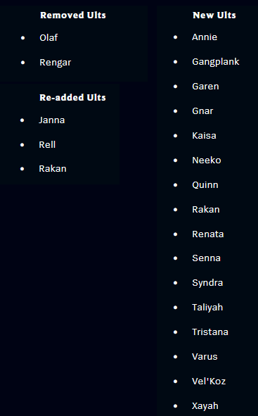 According to the Patch Notes, we now have new ultimate abilities in the pool, while some have been removed from this mode.