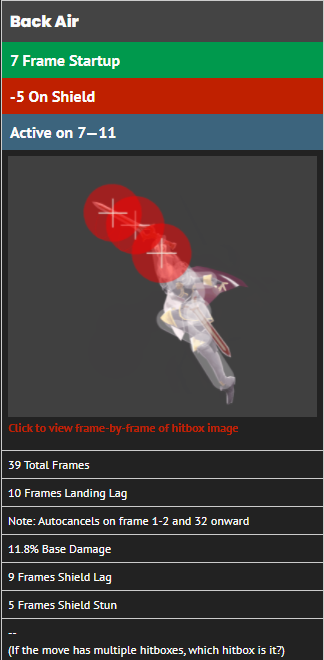 Moving on to an example of much harder auto cancelling, Lucina’s back air is a move that lasts 39 total frames. It’s active on frames 7-11, and it can only be cancelled on frames 1-2 (before the move can do any damage), or after frame 32 of the attack. Thus, while it’s possible the move can be auto cancelled after dealing damage, the time-period of 7 frames (frames 32-39) required is much stricter than Wolf’s 25 (frames 19-44) frame window. If you land during frames 3 to 31, you will have to deal with longer landing lag. On top of this, Lucina only splits her landing lag from 10 frames to 4. While halving this lag is nothing to dismiss, it’s far less noteworthy than Wolf’s reduction of landing lag from 15 frames to 4.