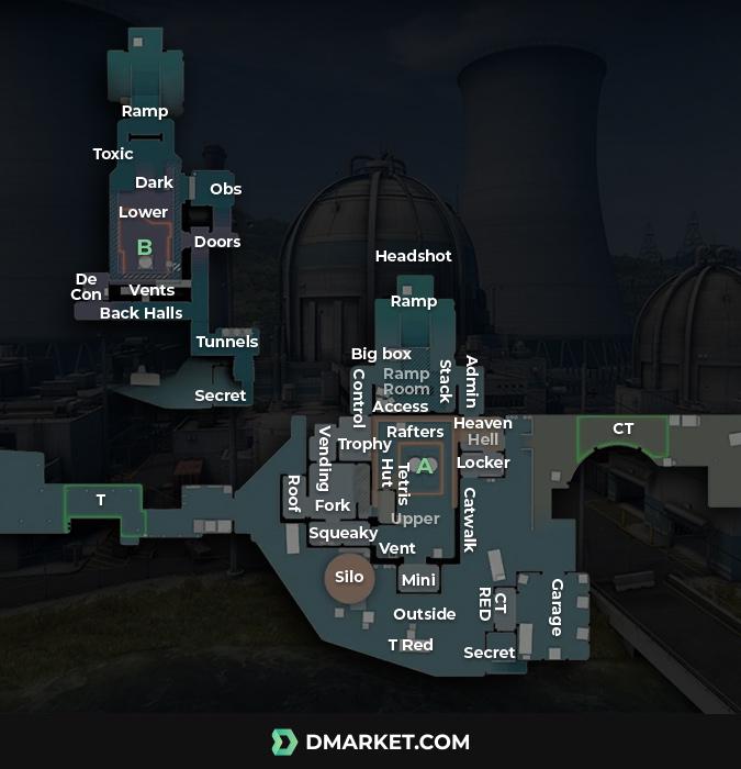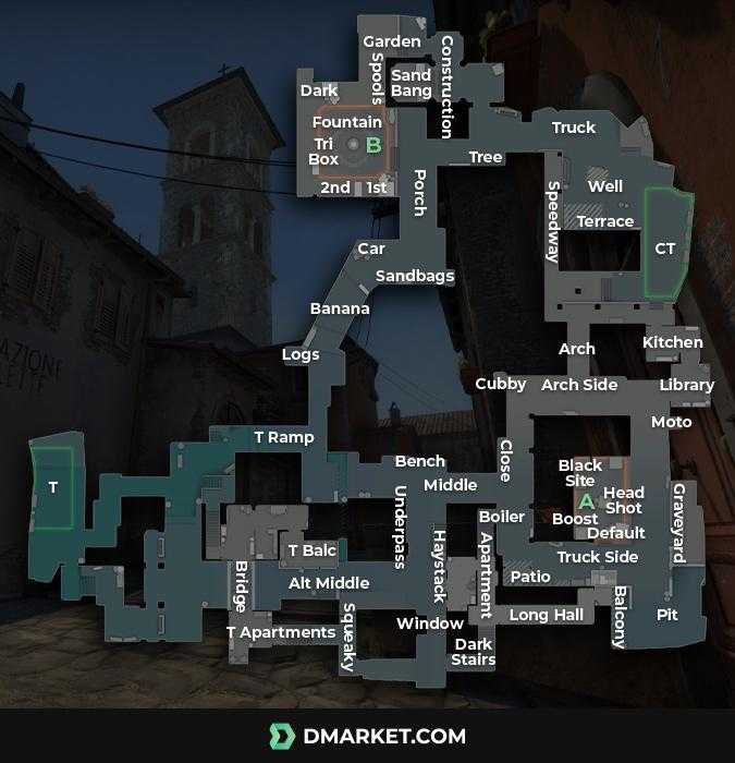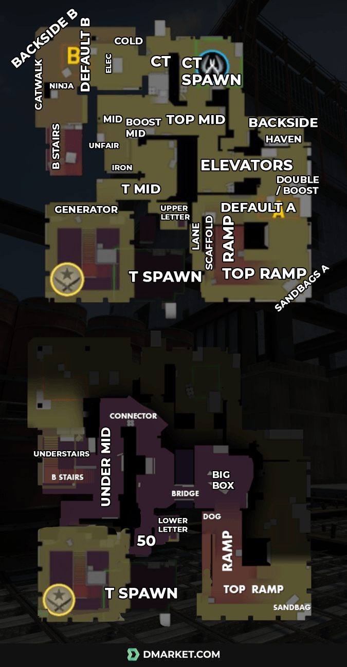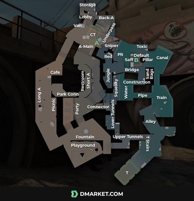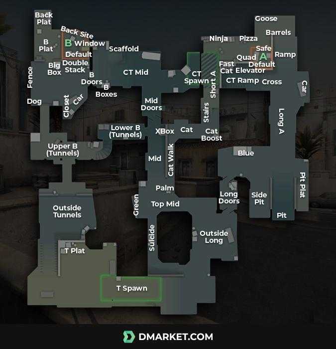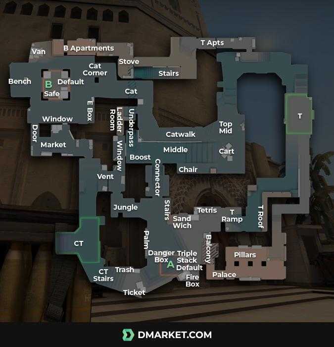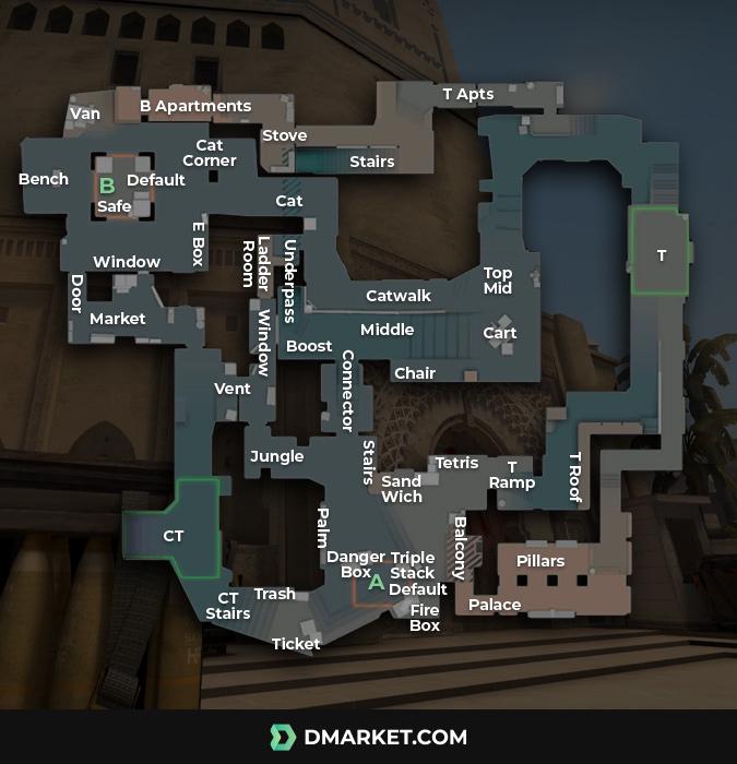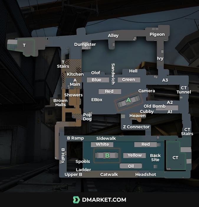 There are many maps and many areas within them. You might think they are hard to remember, and they might seem like they are complicated. Have no fear, they are not. Looking at these photos should give you a clear understanding of locations in the current active map pool. If you aren't sure of a certain spot, hop into CS:GO and go into the map you do not understand well, and start walking around. Make sure to start off in one of the side spawns and just follow the map from there. Go to the place you aren't sure of and open the photo of the map you currently are on. It should tell you what the location's name is.