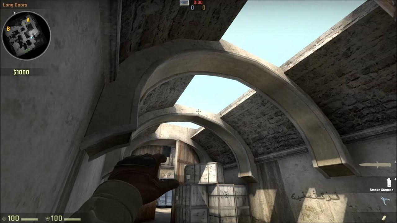 While you have a flash in your hand, hold both mouse buttons for a medium-ranged throw. Then release looking at this position and make sure you get it above the Long Doors railing. Throwing it toward pit while inside Long Doors will have the maximum effectiveness for this popflash. In an empty server, you can get the correct timing for peeking after it flashes your opponent without flashing yourself when you peek again. You want your timing to be not peeking wide, but barely enough to get a shot off at the Long Corner.