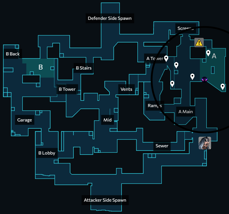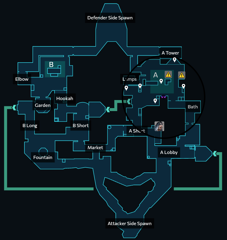 This lineup reveals almost all of A Site, all of A Rafters, and then some of A Tower. All that’s left for your team to clear on A Site is A Elbow. The image below uses ping symbols to show all common angles held by defenders that will be cleared by this lineup. The image also displays a danger symbol, used to warn you that not all angles will be cleared by the Haunt ability.