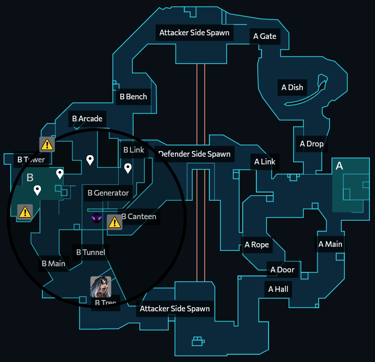 The Haunt lands on top of B Canteen and reveals most of the B Site, some of B Arcade, and then a small amount of B Link. Although the lineup does not reveal too much, it is the best that can be done because of how much of B Site is indoors. The danger symbols in the image below show what is not cleared by Fade’s Haunt ability: