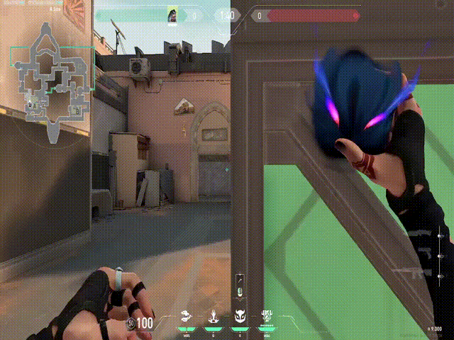 Haven is another great map for Fade: the large buildings placed around the map allow Fade to catch her enemies off-guard with some unexpected lineups. The lineup that we will be showcasing for Haven is a simple defensive lineup for C Long. All you have to do is stand in front of the green radianite boxes and tuck yourself into the corner. Then, aim your crosshair so that it is aligned with the rooftop of the building in front of you. Next, all you have to do is a running, jump throw. This is what it should look like: