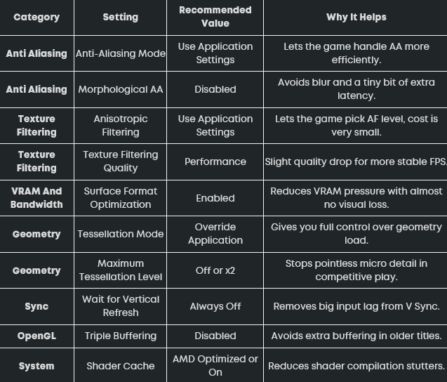 A safe global starting point is to let games control anti aliasing and anisotropic filtering, set texture filtering quality to Performance, enable surface format optimization, disable Morphological AA, and force Wait For Vertical Refresh to Always Off. Combine that with Radeon Anti Lag enabled globally and Radeon Boost and Radeon Chill disabled for ranked matches, and you have a profile that favors FPS and responsiveness without overclocking anything.