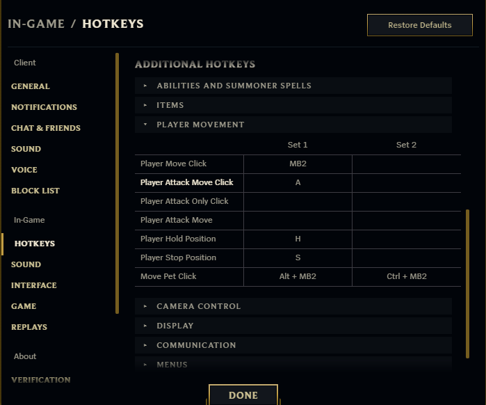Another setting that is exactly preset for you, is the 'Player Attack Move Click'. This feature allows you to input an attack command without pressing the left mouse button as well (like with 'Player Attack Move'). It also does not require you to move your mouse to right click on an enemy to input the attack command. This means less buttons to click for the same result and minimizes your chances of making mechanical errors. On Marksmen champions or other champions that rely heavily on auto-attacking, this setting is crucial. To set up, under 'Settings', click on the 'Hotkeys' tab, and in the 'Player Movement' section, click on the 'Set 1' cell beside 'Player Attack Move Click' and then press your key of choice. For most players (myself included), the 'A' key is best. Otherwise, your 'A' key will still act as 'Player Attack Move' which is less efficient so there's no point in using that setting anyway.