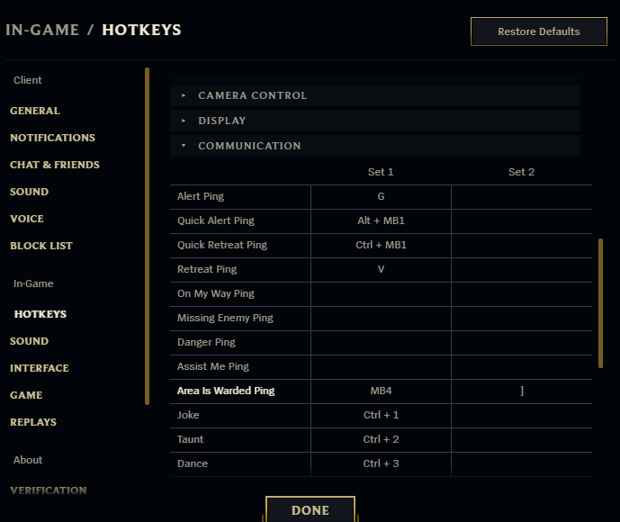 A relatively new feature added to League of Legends is the 'Area Is Warded' smart ping. This smart ping is incredibly useful because you can instantly notify your team of an enemy ward that has been placed. Unlike the other smart pings, you cannot find this ping on the 'smart ping wheel' that you can find when holding down your pinging key. Thus, this setting needs to be set up. To do that, either while in game, or via your 'Settings' Tab on your Client, under the 'Hotkeys' section, open the 'Communication' section. The last option of the smart pings is the 'Area Is Warded Ping'. To set the key binding, click on the 'Set 1' cell and press your desired key that you wish to bind this function to. For example, I have an extra button on the side of my mouse that I do not use for League of Legends, so I used that as my key binding. That way, when I move my mouse to where the ward was placed, I can click the button without pressing any other keys on my keyboard.