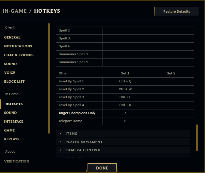 'Target Champions Only' is a vital setting to make sure you don't mis-click in key scenarios when trying to attack enemy champions. This is especially useful when fighting around minion waves, neutral objectives, or towers where you can easily click on any of these things by accident. When this setting is toggled on, your target selecting abilities and attacks will only target enemy champions. To turn on this setting, under 'Hotkeys', click on 'Abilities and Summoner Spells', and scroll down under the 'Other' section. Click on 'Set 1' next to 'Target Champions Only' and bind whatever key works best for you! Once that is done, you need to decide whether you want to have to hold down that key, or just click it once to activate, and then a second time to deactivate. If you want to toggle this setting on and off with one key press and not have to hold the key down, in your 'Settings', in the 'Game' tab, under the 'Gameplay' section, turn on: Treat 'Target Champions Only' as a toggle.