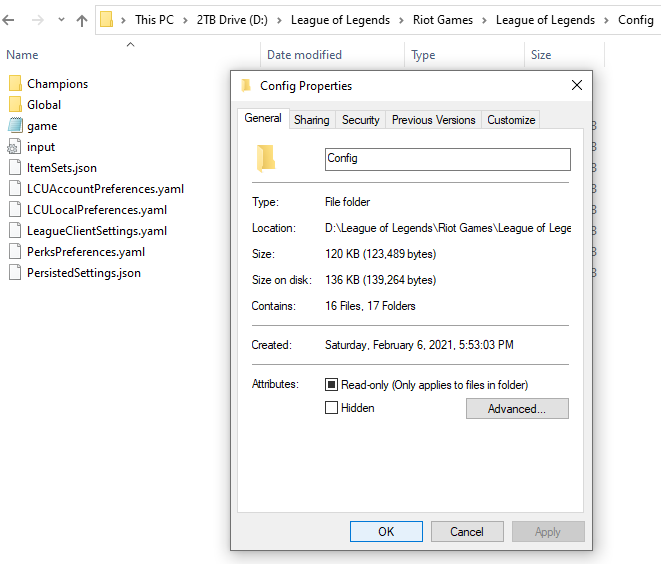 For your convenience, perhaps the most underrated setting for League of Legends players with multiple accounts, is the setting to make all of your League of Legends accounts on your computer have the exact same settings so that you do not have to change all of the settings whenever you make and play on a new account! To do this, simply log onto the account with your desired settings, and while it's open, go to your 'League of Legends' folder in your 'File Explorer' on your computer, open the 'Config' folder, right click on the 'PersistedSettings.json' file, click on 'Properties', and under 'General', in the 'Attributes' section, change the file to 'Read-only' and click 'Apply' to apply the changes.