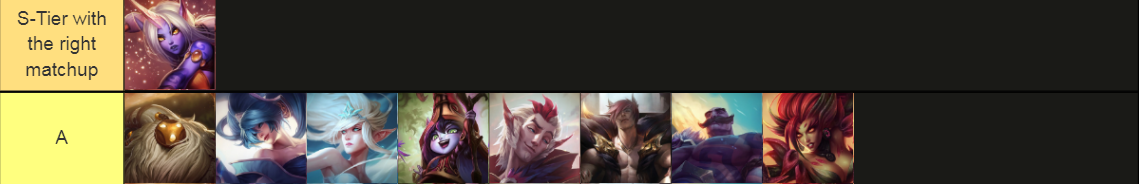 As an honorable mention to the S-Tier, Soraka has the potential to be in S-tier. She’s very close to breaking in, but she requires a good matchup to really break through as that sort of pick, if she gets that matchup she’s there. But she’s otherwise an A-tier pick.”