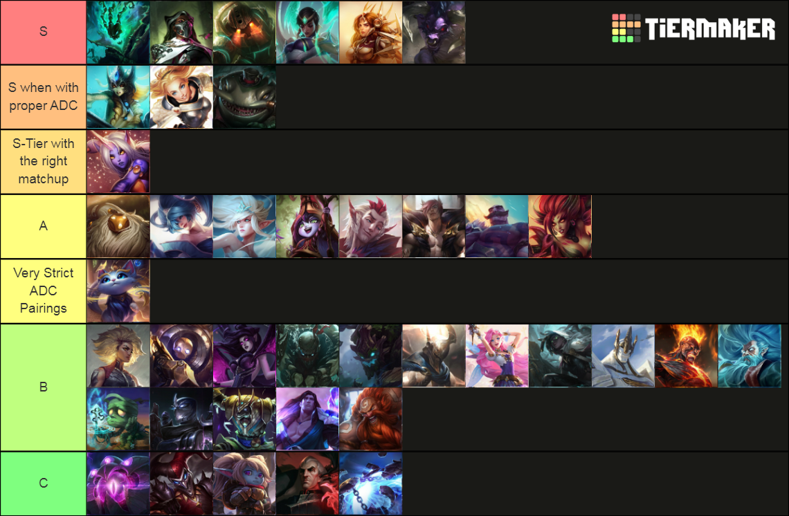 Biofrost: “Morgana is B-tier simply due to the fact that her Black Shield is always going to be powerful but she’s otherwise really weak overall. She’s a good pick into some of the melee Supports, but her matchups are too conditional for her to be higher. Pyke is like Bard, but even less consistent, requiring more Champion mastery. Maokai just hasn’t been as impactful since the sapling nerfs. Pantheon’s changes were good, but more focused at other areas of his play and didn’t do much for him at Support. Seraphine fits into certain comps but is pretty inconsistent beyond her ultimate in those. Galio and down through the rest are generally worse versions of other Champions that are listed higher.”