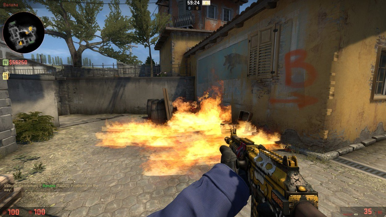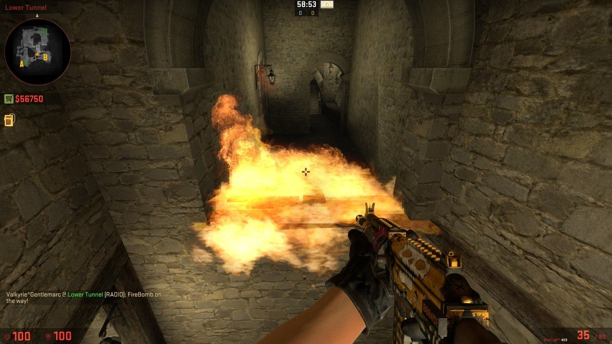 This grenade explodes after a certain amount of time has passed after you have thrown it. If it explodes on, or close to, the ground (or any other flat surface) it will cover a good amount of space in flames. Everyone standing in those flames with 100 HP has roughly three and a half seconds left to get out of it before they die. I should mention that you can put out any flames caused by an incendiary or a molotov with a smoke grenade, which may allow the CTs to survive longer than intended.