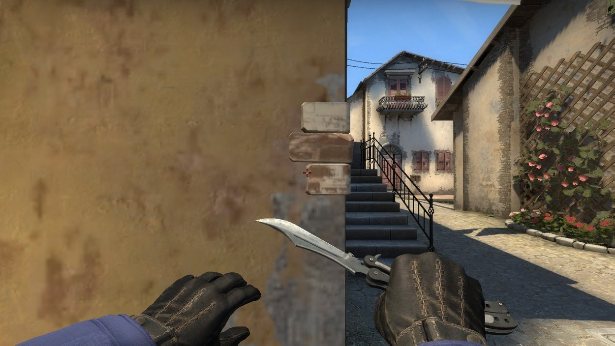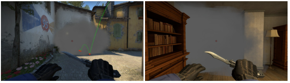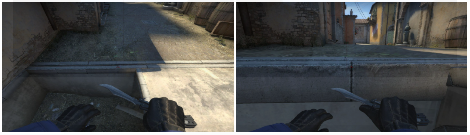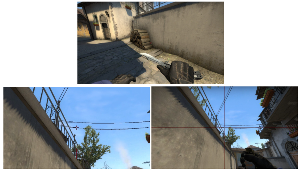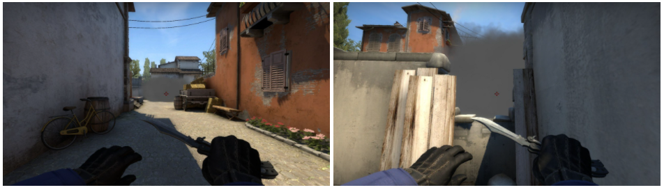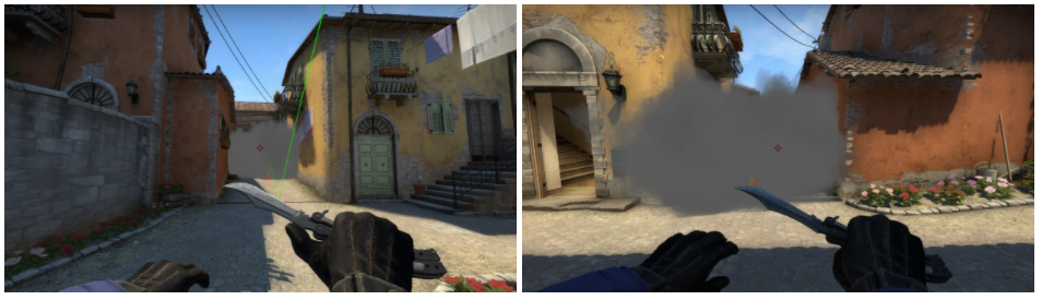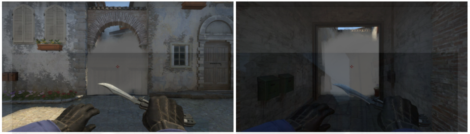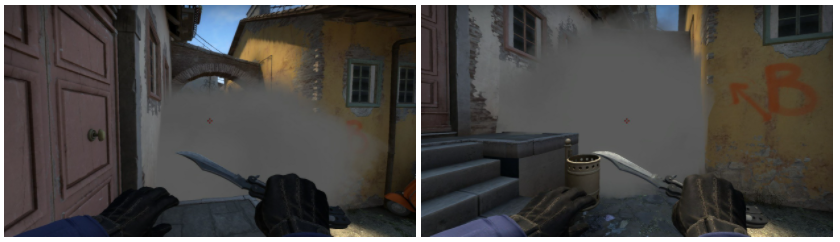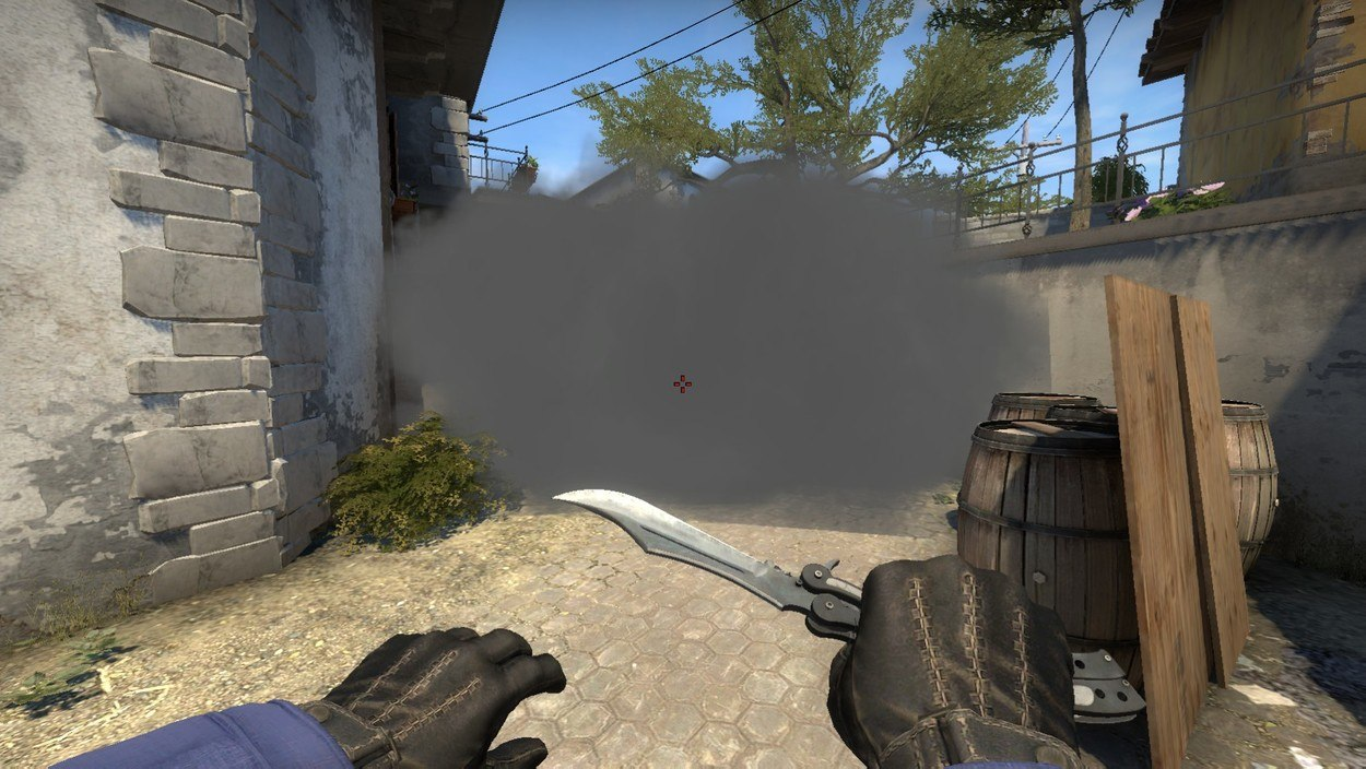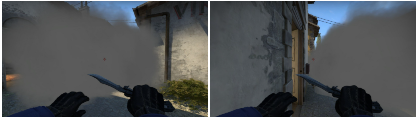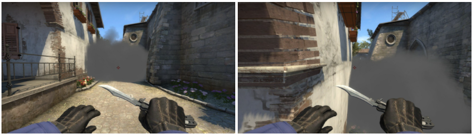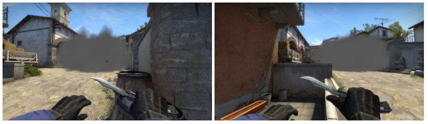 We can easily translate my phrase into a practical use in Counter-Strike: Global Offensive: If you want to gain a safer passageway, you need to smoke off the vision of the opposition. This can be done by placing the smoke grenade between two solid places, like at Brokenwall on Cobblestone, where you can throw a smoke between the wall that is separating B-Long from the B-Bombsite, as well as the crate that is giving the CTs cover close to the stairs. It takes vision away from CTs who are playing on the B-Bombsite or Chicken Coop, which allows you to pass over to the crate. If the gap is bigger, and you cannot use more than one smoke, you may try to throw the smoke in a way that the unavoidable gap only appears close to your destination. This allows for your hitbox to already be in a safe spot once the enemy normally can react to you. If the gap is somewhere else, it may leave the enemy time to trace your movement with their crosshair and spray you, or worse, use an AWP to instakill you. Remember that gapless smokes are always better for you unless you want to try a one-way smoke. This is also true for smokes that try to block off the view of an enemy. Let me try to demonstrate this principle with pictures: