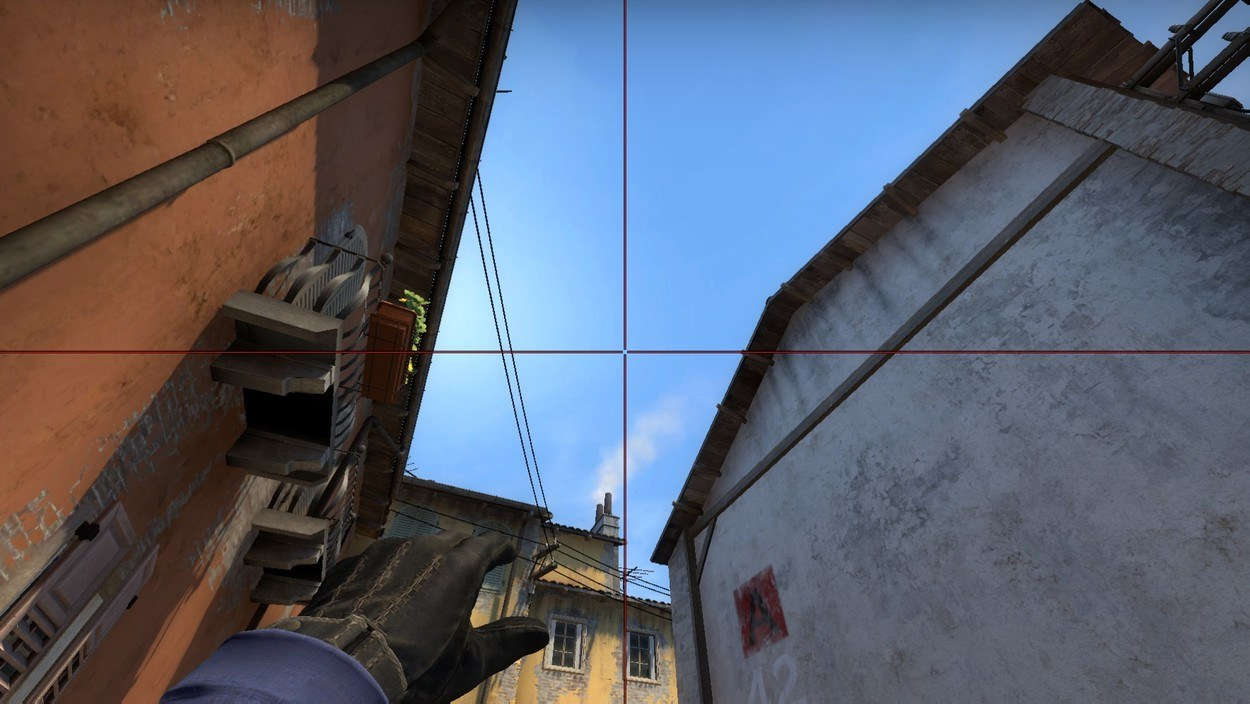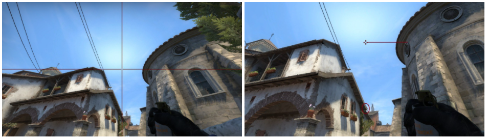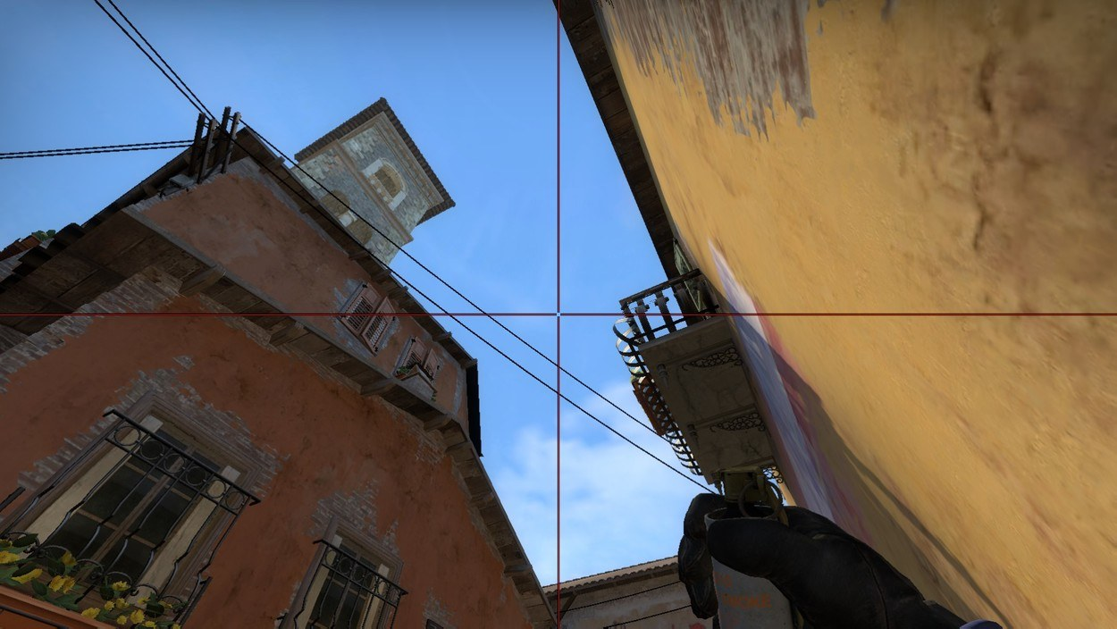 Now you can line up your crosshair with the middle of the chimney, as well as the edge of the balcony above you.