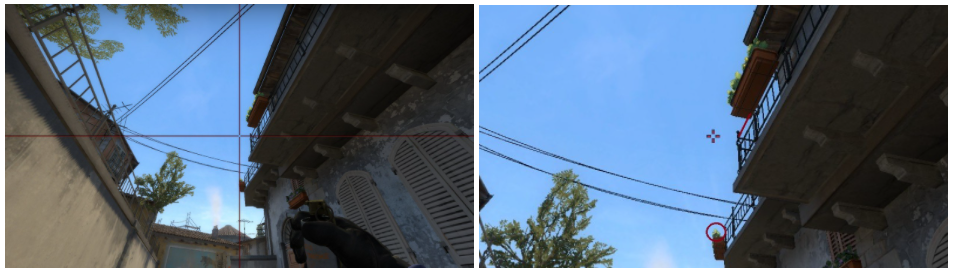 Then, you will need to line up your crosshair with the flowers of the lower flowerpot and the left edge of the upper railing on the right.