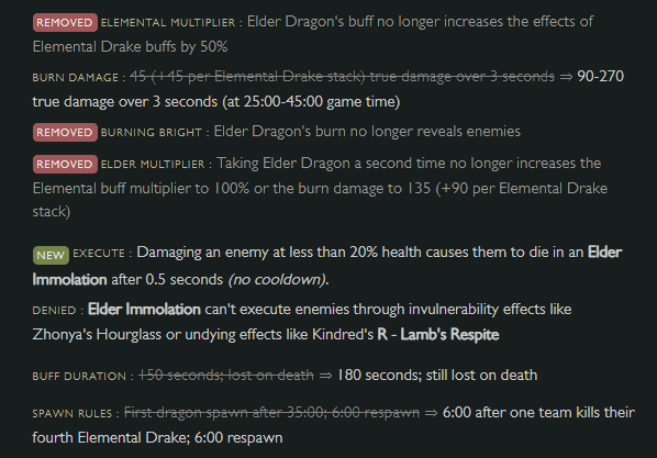 The true damage burn has been removed in favour of a lethal execution that is delivered to enemies when damaged at less than 20% health. As stated in the patch notes, this new Elder Dragon mechanic “(sharpens) its identity as the end-game teamfighting buff”, which is probably the understatement of the century. Trust me, when you get your hands on this buff, you’ll never want to let it go as you blast enemies off the map with screen-shaking force.