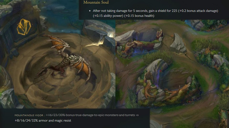 Last season, the Mountain Drake was used for sieging and melting objectives across the map with bonus true damage to turrets and epic monsters. While this was a powerful offensive tool, the new Mountain buff has the potential to be just as game-changing from a defensive standpoint. Granting a percentage increase to your armor and magic resist is powerful no matter who you’re playing, but in a meta where tanks are prevalent in the jungle, top lane, and support, the buff makes these champions even more unkillable as they go deeper into their build.