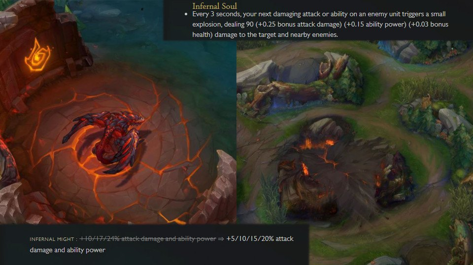 The Infernal Rift opens up the map in both the Jungle and Dragon Pit. Burning away brushes next to the Blue and Red buffs, creating two new pathways into those buffs from behind and expanding the entrance to the Dragon Pit creates a map that provides far less environmental safety for the player and allows for creative flanks and maneuvers on offense. While you might not need as many wards to cover the Jungle, ward placement and keeping a close eye on your defensive wards become vital components of success.