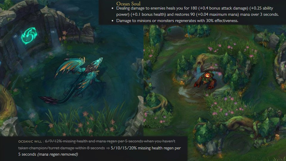 The Ocean Soul may just be the most powerful Soul in Preseason 10 of League of Legends. While the mana regen was removed and the health regen remained effectively unchanged, they both come back out to play with the Soul on your side; dealing damage to enemies will restore health (scaling with bonus AD, AP and bonus health) and mana (scaling with maximum mana), which is 30% less effective against minions and monsters. Wow. This allows for mid-fight sustain and efficient pre-fight trades more than any other buff, benefiting everyone thanks to the wide range of stat scalings.