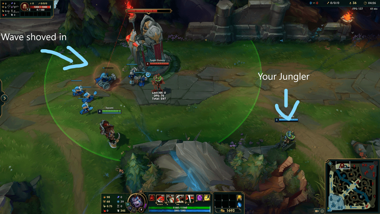 After working through this checklist and you have determined you are stronger, you have more cooldowns available, your Jungler is nearby and able to help you in your dive, and the enemy does not have any reinforcements coming, it is time to set up the dive. First and foremost, push the wave. Like really hard. Make sure you lose as few minions as possible so you are able to have as much time before commencing your dive. After your wave is shoved in, it is important to call some additional help. Whether that is your Mid Laner, Jungler, or just a 2v1 in the Bot Lane, you want all of the odds to be in your favor for a dive in Solo Queue. After you have some help, and you are positive no other help is coming for your opponents, it's time to start the dive. Diving is all about being able to deal enough damage while avoiding as much as possible from the turret.