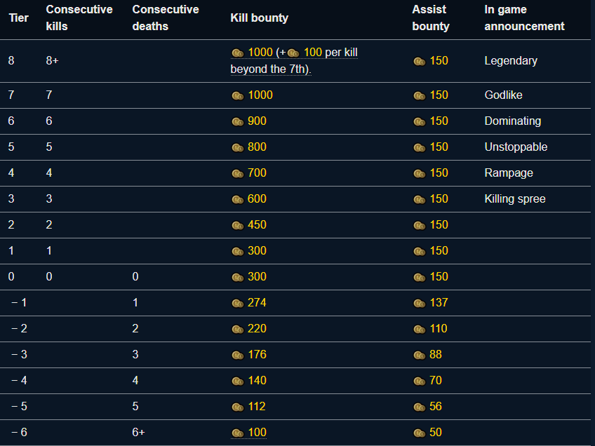 So why are we talking about minions? Why does their gold value and experience matter? I can get those from killing the enemy champion. The first kill on an enemy champion gives you a flat 300 gold and an extra 100 if it is First Blood. From then on, if you keep killing the same champion over and over again, the gold value they give you actually decreases. It goes down from 300 to 100 gold at the lowest. I am not saying do not kill your opponent over and over again. That allows you to have a numbers advantage and do what you like on the map. I am saying do not rely on killing champions as your source of income as their gold value drops.